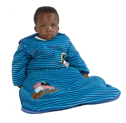 Our Pirate travel baby sleeping bag is a blue striped soft velour travel sleeping bag with removable arms.;This item is very handy if your child falls asleep whilst out and about in the car, pushchair or a buggy;The arms can be removed using the poppers placed around the top of the arm;Material Composition : 80% cotton/20% polyester outer, 100% cotton lining;3.5 Tog baby sleeping bags are suitable for winter temperatures. For use with room/nursery temperatures below 60?F.