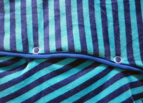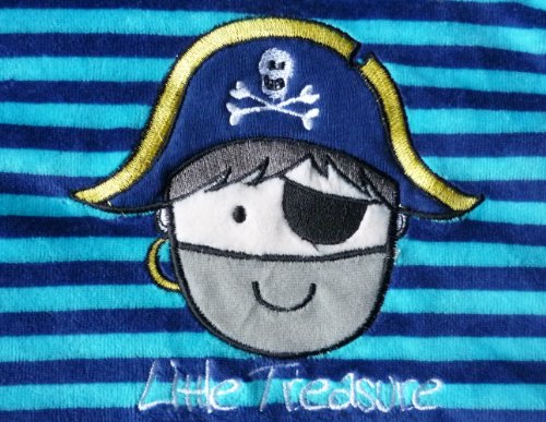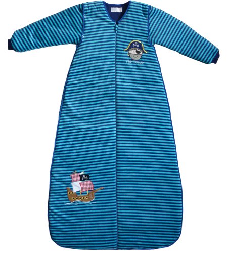 Our Pirate travel baby sleeping bag is a blue striped soft velour travel sleeping bag with removable arms.;The arms can be removed using the poppers placed around the top of the arm;2.5 Tog baby sleeping bags are suitable for all year round, except peak summer temperatures. For use with room/nursery temperatures between 60?F and 70?F.;Material Composition : 80% cotton/20% polyester outer, 100% cotton lining;Please note: The 3-6 years size has the zip down the middle of the bag and has no slot/opening for pushchair/stroller harnesses or car seat belts.