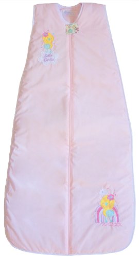 This new 100% cotton design is a pale pink sleeping bag, featuring a cute yellow and blue bird, with the lilac embroidered words 'Little Birdie' on the chest of the bag.;Our cute birdie is also embroidered along with a rainbow, cloud and some stars at the bottom of the sleeping bag.;The sleeping bag is trimmed with white material and the entire reverse of the bag is covered in a colourful modern flower pattern in shades of pink, lilac, aqua and white.;The 6-18 month baby sleeping bag has a full length front zip (as shown) and is 36 inches in length.;3.5 Tog baby sleeping bags are suitable for winter temperatures. For use with room/nursery temperatures below 60?F.