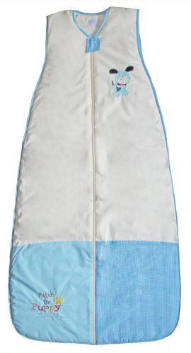 This new 100% cotton baby sleeping bag features an adorable little blue and white puppy that we have named Patch, on a plain cream background.;The foot of the sleeping bag is partly covered with a light blue colour, embroidered with the words 'Patch the Puppy' and a paw print, alongside blue gingham material.;The sleeping bag is trimmed with a light blue colour and the entire reverse of the bag is covered with the same blue gingham material as the front.;The 18-36 month baby sleeping bag has a full length front zip (as shown) and is 44 inches in length.;1.0 Tog baby sleeping bags are suitable for summer months and daytime naps when nursery temperatures become warmer. For use with room/nursery temperatures between 64?F and 75?F.