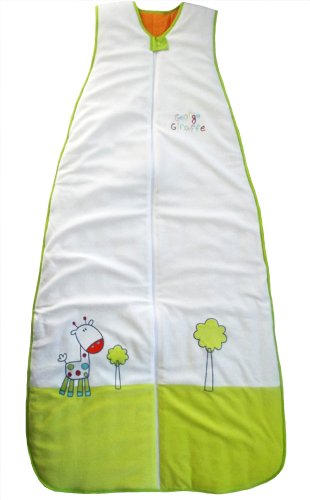 This 100% cotton white velour baby sleeping bag design is trimmed with lime green material and features a brightly coloured giraffe whom we have named George;The words 'George Giraffe' are embroidered on the chest of the bag;The reverse of the bag is a pastel yellow/orange colour