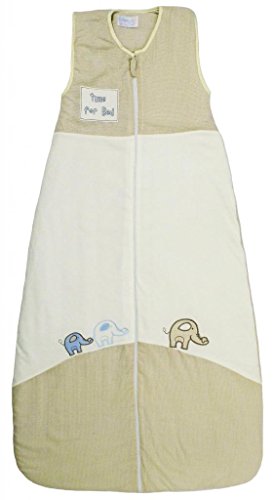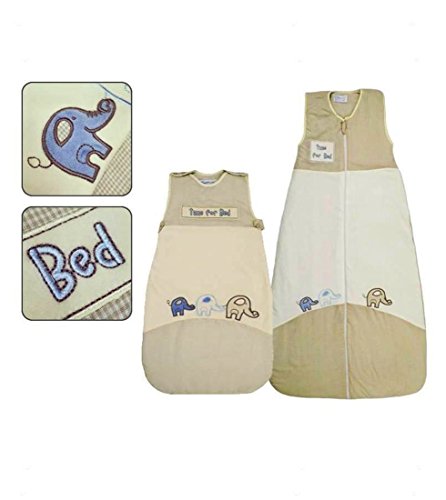 This 100% cotton cream coloured sleeping bag is trimmed with gingham material on the chest, bottom and reverse of the bag.;The words 'Time for Bed' are embroidered across the chest;There are three cute appliqu?d elephants on the velour lower part of the sleeping bag in blue/grey marl and sandy colours.;Material Composition : 100% cotton outer, 100% cotton lining, 100% polyester filling/padding. 3.5 Tog is suitable for winter temperatures (For use with room/nursery temperatures below 60');The 3-6 year baby sleeping bag has a full length front zip and is 51 inches in length.