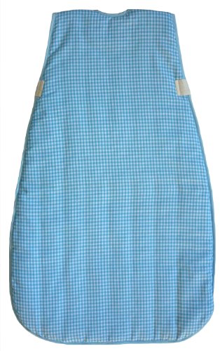 This 0-6 month sleeping bag is 28 inches in length and has has a side zip (as shown);This new 100% cotton baby sleeping bag features an adorable little blue and white puppy that we have named Patch, on a plain cream background.;The foot of the sleeping bag is partly covered with a light blue colour, embroidered with the words 'Patch the Puppy' and a paw print, alongside blue gingham material.;The sleeping bag is trimmed with a light blue colour and the entire reverse of the bag is covered with the same blue gingham material as the front.