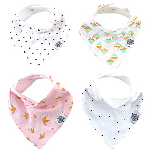 SOFT ORGANIC AND ABSORBENT MATERIAL - Our stylish baby bandana drool bibs are 100% soft organic cotton on the front and 100% soft polyester on the back for added absorbency. Teething babies drool A LOT and our baby bibs keep clothes dry. No more drool rings on your baby's clothes!;FASHIONABLE, STYLISH AND COMFORTABLE- Each bandana bib is professionally designed to be versatile enough for any outfit. Our drool bibs are a practical and trendy solution to drooling/teething babies. Let our bandana baby bibs absorb your baby's drool in style!;BABY REGISTRY GIFT SET - Our 4 pack of cute baby bibs makes for a thoughtful baby shower gift and a practical and stylish baby registry item.;ADJUSTABLE SIZES - The Good Baby Bandana Bibs have 2 nickel-free snaps that adjust to your growing baby. Our baby bandanas are recommended from babies aging from 3 to 24 months.;SATISFACTION GUARANTEED - We founded our company in hopes of simplifying parenthood so that you can spend more time enjoying your little one. If our products don't live up to your expectations, let us know and we will fix it!