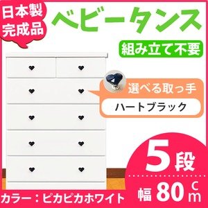 取っ手が選べるハイチェスト/タンス 80cm幅 5段(本体:ピカピカホワイト 取っ手:ハートブラック×全10個) 【日本製】【完成品】