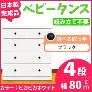 取っ手が選べるハイチェスト/タンス 80cm幅 4段(本体:ピカピカホワイト 取っ手:ブラック×全8個) 【日本製】【完成品】