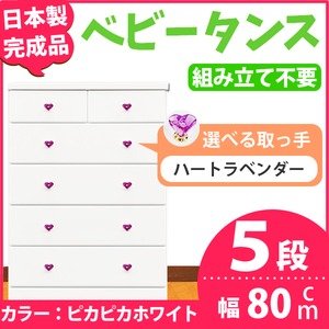 取っ手が選べるハイチェスト/タンス 80cm幅 5段(本体:ピカピカホワイト 取っ手:ハートラベンダー×全10個) 【日本製】【完成品】