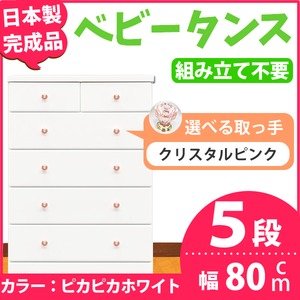 取っ手が選べるハイチェスト/タンス 80cm幅 5段(本体:ピカピカホワイト 取っ手:クリスタルピンク×全10個) 【日本製】【完成品】