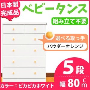 取っ手が選べるハイチェスト/タンス 80cm幅 5段(本体:ピカピカホワイト 取っ手:パウダーオレンジ×全10個) 【日本製】【完成品】