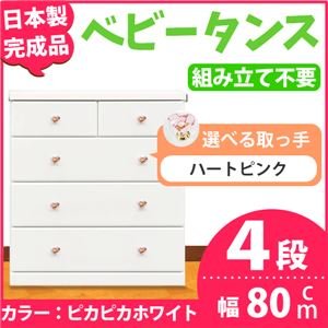取っ手が選べるハイチェスト/タンス 80cm幅 4段(本体:ピカピカホワイト 取っ手:ハートピンク×全8個) 【日本製】【完成品】