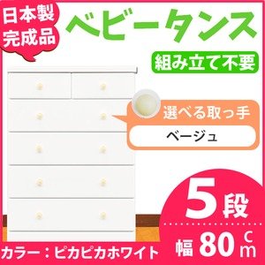 取っ手が選べるハイチェスト/タンス 80cm幅 5段(本体:ピカピカホワイト 取っ手:ベージュ×全10個) 【日本製】【完成品】