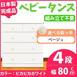 取っ手が選べるハイチェスト/タンス 80cm幅 4段(本体:ピカピカホワイト 取っ手:ベージュ×全8個) 【日本製】【完成品】