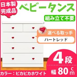 取っ手が選べるハイチェスト/タンス 80cm幅 4段(本体:ピカピカホワイト 取っ手:ハートレッド×全8個) 【日本製】【完成品】