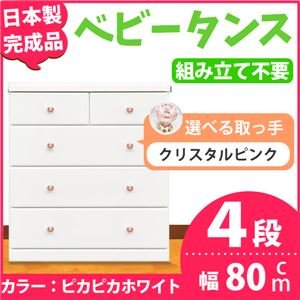 取っ手が選べるハイチェスト/タンス 80cm幅 4段(本体:ピカピカホワイト 取っ手:クリスタルピンク×全8個) 【日本製】【完成品】