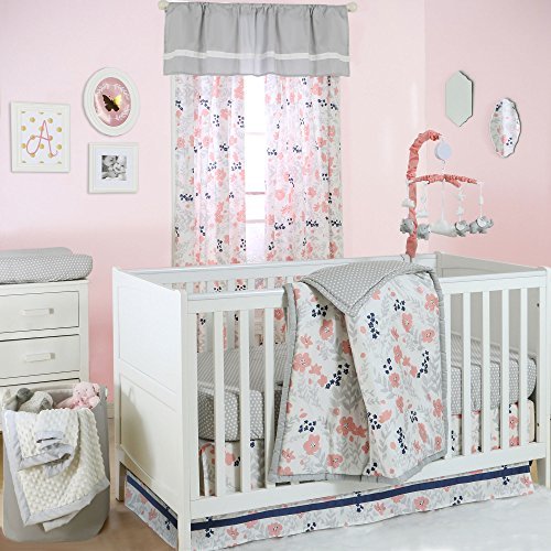 100% cotton sateen fabrics highlight this premium quality floral print in coral pink, grey and navy blue combined with a sophisticated confetti dot on grey; 4 piece set includes reversible quilt, fitted sheet, tailored dust ruffle, and musical mobile; individual components of this set are also available for purchase separately;Generously sized at 44 by 37 inches, the 100% cotton quilt will find a host of uses in and out of the nursery, inside and outside the home; perfect for tummy-time;Crib skirt, with a 14 inch drop, and the fitted crib sheet are designed to fit a standard sized crib with a mattress measuring 52 by 28 inches; all-around elastic will assure that the sheet fits safely and securely every time;Musical mobile features elephants, clouds, and stars and plays a gentle lullaby to soothe baby to sleep;The Peanut Shell, through this mix and match collection, offers a host of coordinating items for your nursery, including: window treatments, crib rail guards, blankets, alternate sheets, and changing pad covers