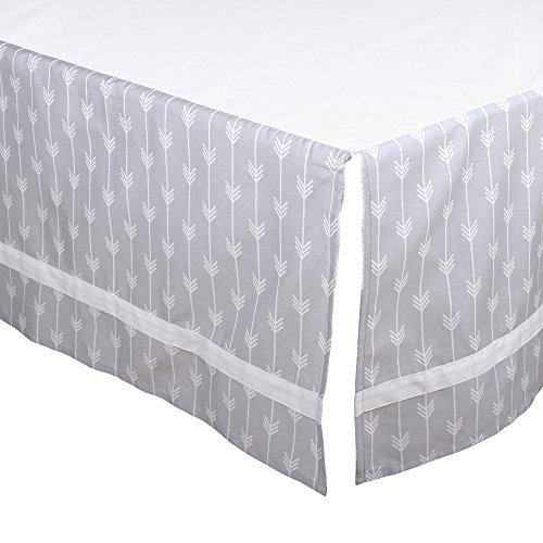 100% cotton sateen fabrics highlight this premium quality grey and white cloud print crib bedding set; 4 piece set includes reversible quilt, cloud print fitted sheet, tailored arrow stripe dust ruffle, and musical mobile; individual components of this set are also available for purchase separately;Generously sized at 44 by 37 inches, the 100% cotton quilt will find a host of uses in and out of the nursery, inside and outside the home; perfect for tummy-time;Crib skirt, with a 14 inch drop, and the fitted crib sheet are designed to fit a standard sized crib with a mattress measuring 52 by 28 inches; all-around elastic will assure that the sheet fits safely and securely every time;Musical mobile features grey elephants and white clouds and stars and plays a gentle lullaby to soothe baby to sleep;The Peanut Shell, through this mix and match collection, offers a host of coordinating items for your nursery, including: window treatments, crib rail guards, blankets, alternate sheets, and changing pad covers