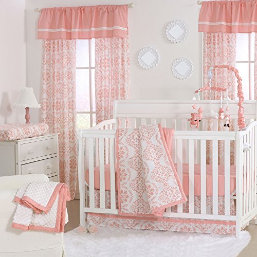 100% cotton sateen fabrics highlight this premium quality coral pink medallion print; 4 piece set includes reversible quilt, fitted sheet, tailored dust ruffle, and musical mobile; individual components of this set are also available for purchase separately;Generously sized at 44 by 37 inches, the 100% cotton quilt will find a host of uses in and out of the nursery, inside and outside the home; perfect for tummy-time;Crib skirt, with a 14 inch drop, and the fitted crib sheet are designed to fit a standard sized crib with a mattress measuring 52 by 28 inches; all-around elastic will assure that the sheet fits safely and securely every time;Musical mobile features forest animals, clouds, and stars and plays a gentle lullaby to soothe baby to sleep;The Peanut Shell, through this mix and match collection, offers a host of coordinating items for your nursery, including: window treatments, crib rail guards, blankets, alternate sheets, and changing pad covers