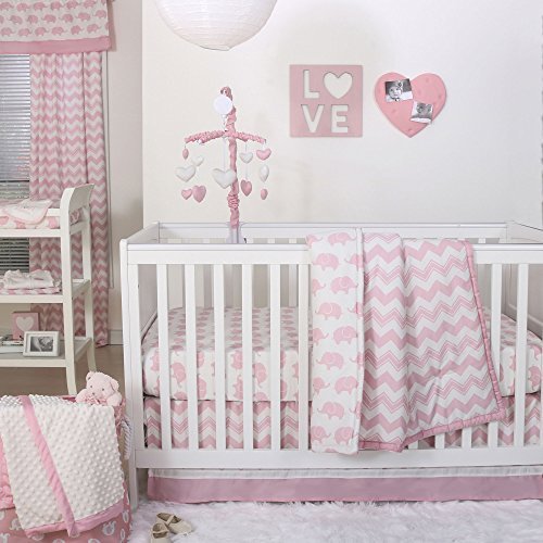 100% cotton sateen fabrics highlight this premium quality pink chevron and elephant print crib bedding set; 4 piece set includes reversible quilt, elephant print fitted sheet, tailored pink chevron dust ruffle, and musical mobile; individual components of this set are also available for purchase separately;Generously sized at 44 by 37 inches, the 100% cotton quilt will find a host of uses in and out of the nursery, inside and outside the home; perfect for tummy-time;Crib skirt, with a 14 inch drop, and the fitted crib sheet are designed to fit a standard sized crib with a mattress measuring 52 by 28 inches; all-around elastic will assure that the sheet fits safely and securely every time;Musical mobile features pink and white hearts and plays a gentle lullaby to soothe baby to sleep;The Peanut Shell, through this mix and match collection, offers a host of coordinating items for your nursery, including: window treatments, crib rail guards, blankets, alternate sheets, and changing pad covers