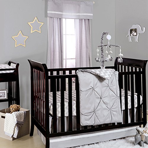 100% cotton sateen fabrics highlight this combination of pintuck design, where fabric is gathered to create an elegant textured appearance, and grey zig zag prints; 4 piece set includes reversible quilt, fitted sheet, tailored dust ruffle, and musical mobile; individual components of this set are also available for purchase separately;Generously sized at 44 by 37 inches, the 100% cotton quilt will find a host of uses in and out of the nursery, inside and outside the home; perfect for tummy-time;Crib skirt, with a 14 inch drop, and the fitted crib sheet are designed to fit a standard sized crib with a mattress measuring 52 by 28 inches; all-around elastic will assure that the sheet fits safely and securely every time;Musical mobile features elephants, clouds, and stars and plays a gentle lullaby to soothe baby to sleep;The Peanut Shell, through this mix and match collection, offers a host of coordinating items for your nursery, including: window treatments, crib rail guards, blankets, alternate sheets, and changing pad covers