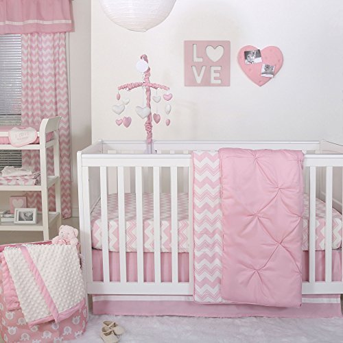 100% cotton sateen fabrics highlight this combination of pintuck design, where fabric is gathered to create an elegant textured appearance, and pink zig zag prints; 4 piece set includes reversible quilt, fitted sheet, tailored dust ruffle, and musical mobile; individual components of this set are also available for purchase separately;Generously sized at 44 by 37 inches, the 100% cotton quilt will find a host of uses in and out of the nursery, inside and outside the home; perfect for tummy-time;Crib skirt, with a 14 inch drop, and the fitted crib sheet are designed to fit a standard sized crib with a mattress measuring 52 by 28 inches; all-around elastic will assure that the sheet fits safely and securely every time;Musical mobile features pink and white hearts and plays a gentle lullaby to soothe baby to sleep;The Peanut Shell, through this mix and match collection, offers a host of coordinating items for your nursery, including: window treatments, crib rail guards, blankets, alternate sheets, and changing pad covers