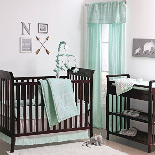 100% cotton sateen fabrics highlight this combination of mint green geometric tribal prints with mint arrows; 4 piece set includes reversible quilt, fitted sheet, tailored dust ruffle, and musical mobile; individual components of this set are also available for purchase separately;Generously sized at 44 by 37 inches, the 100% cotton quilt will find a host of uses in and out of the nursery, inside and outside the home; perfect for tummy-time;Crib skirt, with a 14 inch drop, and the fitted crib sheet are designed to fit a standard sized crib with a mattress measuring 52 by 28 inches; all-around elastic will assure that the sheet fits safely and securely every time;Musical mobile features elephants, clouds, and stars and plays a gentle lullaby to soothe baby to sleep;The Peanut Shell, through this mix and match collection, offers a host of coordinating items for your nursery, including: window treatments, crib rail guards, blankets, alternate sheets, and changing pad covers