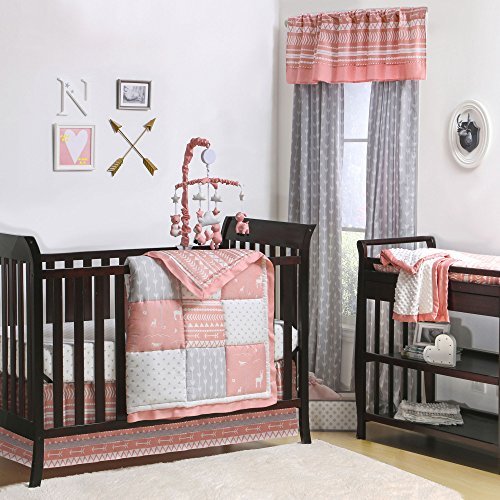 100% cotton sateen fabrics highlight this premium quality patchwork of coral pink woodland and tribal prints and grey arrow and triangle dot designs; 4 piece set includes reversible quilt, fitted sheet, tailored dust ruffle, and musical mobile; individual components of this set are also available for purchase separately;Generously sized at 44 by 37 inches, the 100% cotton quilt will find a host of uses in and out of the nursery, inside and outside the home; perfect for tummy-time;Crib skirt, with a 14 inch drop, and the fitted crib sheet are designed to fit a standard sized crib with a mattress measuring 52 by 28 inches; all-around elastic will assure that the sheet fits safely and securely every time;Musical mobile features forest animals, clouds, and stars and plays a gentle lullaby to soothe baby to sleep;The Peanut Shell, through this mix and match collection, offers a host of coordinating items for your nursery, including: window treatments, crib rail guards, blankets, alternate sheets, and changing pad covers
