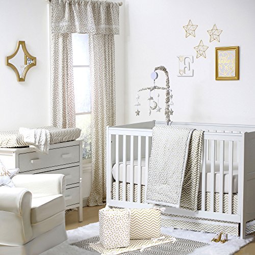 100% cotton sateen fabrics highlight this premium quality combination of gold confetti dot and zig zag; 5 piece set includes reversible quilt, reversible bumper, white fitted sheet, tailored chevron dust ruffle, and musical mobile; individual components of this set are also available for purchase separately;Generously sized at 44 by 37 inches, the 100% cotton quilt will find a host of uses in and out of the nursery, inside and outside the home; perfect for tummy-time;Crib skirt, with a 14 inch drop, and the fitted crib sheet are designed to fit a standard sized crib with a mattress measuring 52 by 28 inches; all-around elastic will assure that the sheet fits safely and securely every time;Reversible 4-piece bumper provides numerous decorative options - face them all in the same direction or mix them up to create your own unique look; musical mobile features moon, clouds, and stars and plays a gentle lullaby to soothe baby to sleep;The Peanut Shell, through this mix and match collection, offers a host of coordinating items for your nursery, including: window treatments, crib rail guards, blankets, alternate sheets, and changing pad covers