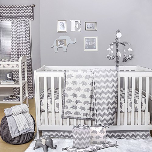 100% cotton sateen fabrics highlight this premium quality combination of grey elephants and a contemporary chevron print; 5 piece set includes reversible quilt, reversible bumper, fitted sheet, tailored dust ruffle, and musical mobile; individual components of this set are also available for purchase separately;Generously sized at 44 by 37 inches, the 100% cotton quilt will find a host of uses in and out of the nursery, inside and outside the home; perfect for tummy-time;Crib skirt, with a 14 inch drop, and the fitted crib sheet are designed to fit a standard sized crib with a mattress measuring 52 by 28 inches; all-around elastic will assure that the sheet fits safely and securely every time;Reversible 4-piece bumper provides numerous decorative options - face them all in the same direction or mix them up to create your own unique look; musical mobile features moon, clouds, and stars and plays a gentle lullaby to soothe baby to sleep;The Peanut Shell, through this mix and match collection, offers a host of coordinating items for your nursery, including: window treatments, crib rail guards, blankets, alternate sheets, and changing pad covers