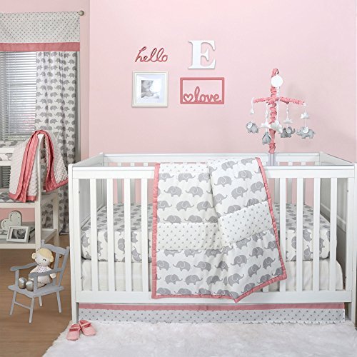 100% cotton sateen fabrics highlight this premium quality combination of grey elephants and a contemporary triangle dot print highlighted with coral pink; 4 piece set includes reversible quilt, fitted sheet, tailored dust ruffle, and musical mobile; individual components of this set are also available for purchase separately;Generously sized at 44 by 37 inches, the 100% cotton quilt will find a host of uses in and out of the nursery, inside and outside the home; perfect for tummy-time;Crib skirt, with a 14 inch drop, and the fitted crib sheet are designed to fit a standard sized crib with a mattress measuring 52 by 28 inches; all-around elastic will assure that the sheet fits safely and securely every time;Musical mobile features elephants, clouds, and stars and plays a gentle lullaby to soothe baby to sleep;The Peanut Shell, through this mix and match collection, offers a host of coordinating items for your nursery, including: window treatments, crib rail guards, blankets, alternate sheets, and changing pad covers