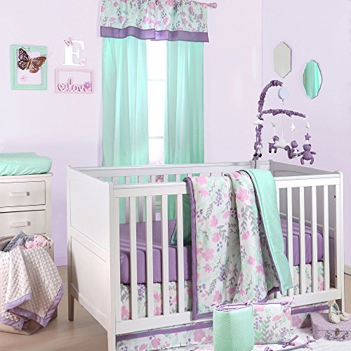 100% cotton sateen fabrics highlight this premium quality floral print in pink, mint green, purple, and grey combined with a sophisticated mint green confetti dot design; 5 piece set includes reversible quilt, reversible bumper, fitted sheet, tailored dust ruffle, and musical mobile; individual components of this set are also available for purchase separately;Generously sized at 44 by 37 inches, the 100% cotton quilt will find a host of uses in and out of the nursery, inside and outside the home; perfect for tummy-time;Crib skirt, with a 14 inch drop, and the fitted crib sheet are designed to fit a standard sized crib with a mattress measuring 52 by 28 inches; all-around elastic will assure that the sheet fits safely and securely every time;Reversible 4-piece bumper provides numerous decorative options - face them all in the same direction or mix them up to create your own unique look; musical mobile features purple forest animals and plays a gentle lullaby to soothe baby to sleep;The Peanut Shell, through this mix and match collection, offers a host of coordinating items for your nursery, including: window treatments, crib rail guards, blankets, alternate sheets, and changing pad covers