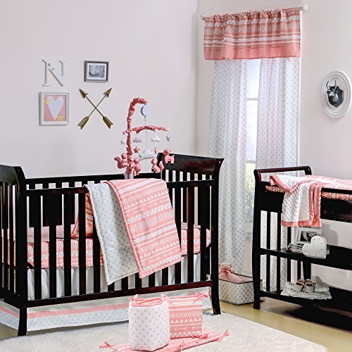 100% cotton sateen fabrics highlight this combination of coral pink geometric tribal prints with grey triangle dots; 5 piece set includes reversible quilt, reversible bumper, fitted sheet, tailored dust ruffle, and musical mobile; individual components of this set are also available for purchase separately;Generously sized at 44 by 37 inches, the 100% cotton quilt will find a host of uses in and out of the nursery, inside and outside the home; perfect for tummy-time;Crib skirt, with a 14 inch drop, and the fitted crib sheet are designed to fit a standard sized crib with a mattress measuring 52 by 28 inches; all-around elastic will assure that the sheet fits safely and securely every time;Reversible 4-piece bumper provides numerous decorative options - face them all in the same direction or mix them up to create your own unique look; musical mobile features forest animals, clouds, and stars and plays a gentle lullaby to soothe baby to sleep;The Peanut Shell, through this mix and match collection, offers a host of coordinating items for your nursery, including: window treatments, crib rail guards, blankets, alternate sheets, and changing pad covers