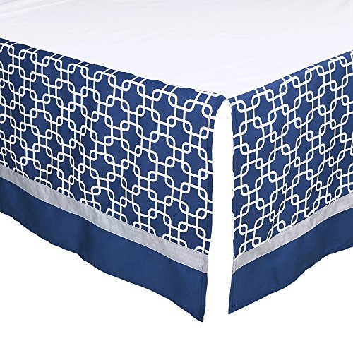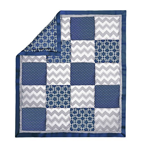 100% cotton sateen fabrics highlight this premium quality patchwork of navy blue geometric and dot prints combined with grey chevron; 3 piece set includes reversible quilt, fitted sheet, and tailored dust ruffle; individual components of this set are also available for purchase separately;Generously sized at 44 by 37 inches, the 100% cotton quilt will find a host of uses in and out of the nursery, inside and outside the home; perfect for tummy-time;Fitted crib sheet is designed to fit a standard sized crib with a mattress measuring 52 by 28 inches; all-around elastic will assure that the sheet fits safely and securely every time;Tailored crib dust ruffle from The Peanut Shell features a contemporary geometric print in navy and white accented with grey trim;The Peanut Shell, through this mix and match collection, offers a host of coordinating items for your nursery, including: window treatments, crib rail guards, blankets, alternate sheets, and changing pad covers
