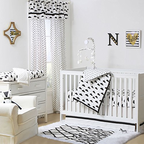 100% cotton sateen fabrics highlight this premium quality black and white cloud print crib bedding set; 3 piece set includes reversible quilt, cloud print fitted sheet, and tailored dust ruffle; individual components of this set are also available for purchase separately;Generously sized at 44 by 37 inches, the 100% cotton quilt will find a host of uses in and out of the nursery, inside and outside the home; perfect for tummy-time;Fitted crib sheet is designed to fit a standard sized crib with a mattress measuring 52 by 28 inches; all-around elastic will assure that the sheet fits safely and securely every time;Solid white crib dust ruffle from The Peanut Shell features a classic tailored design with black trim;The Peanut Shell, through this mix and match collection, offers a host of coordinating items for your nursery, including: window treatments, crib rail guards, blankets, alternate sheets, and changing pad covers