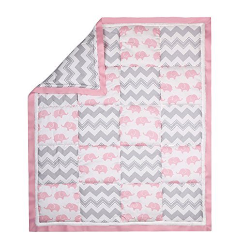 100% cotton sateen fabrics highlight this premium quality patchwork of pink elephants and a contemporary grey zig zag print; 3 piece set includes reversible quilt, fitted sheet, and tailored dust ruffle; individual components of this set are also available for purchase separately;Generously sized at 44 by 37 inches, the 100% cotton quilt will find a host of uses in and out of the nursery, inside and outside the home; perfect for tummy-time;Fitted crib sheet is designed to fit a standard sized crib with a mattress measuring 52 by 28 inches; all-around elastic will assure that the sheet fits safely and securely every time;Tailored crib dust ruffle from The Peanut Shell is crisp white accented with pink and grey;The Peanut Shell, through this mix and match collection, offers a host of coordinating items for your nursery, including: window treatments, crib rail guards, blankets, alternate sheets, and changing pad covers