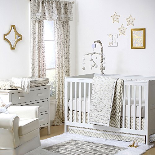 100% cotton sateen fabrics highlight this premium quality combination of gold confetti dot and zig zag; 3 piece set includes reversible quilt, white fitted sheet, and tailored chevron dust ruffle; individual components of this set are also available for purchase separately;Generously sized at 44 by 37 inches, the 100% cotton quilt will find a host of uses in and out of the nursery, inside and outside the home; perfect for tummy-time;Fitted crib sheet is designed to fit a standard sized crib with a mattress measuring 52 by 28 inches; all-around elastic will assure that the sheet fits safely and securely every time;Tailored crib dust ruffle from The Peanut Shell features a metallic gold and white chevron print to add some sparkle to the nursery;The Peanut Shell, through this mix and match collection, offers a host of coordinating items for your nursery, including: window treatments, crib rail guards, blankets, alternate sheets, and changing pad covers