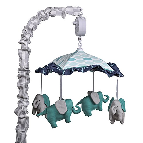 With the Peanut Shell Mosaic Musical Mobile, your child can gaze at fanciful elephants while hearing a peaceful lullaby.Designed to clip on to a standard crib railing, this mobile is adorned with fresh geometric prints in white and shades of blue.No batteries required.Remove from crib when your baby can push up on hands and knees.About The Peanut Shell The Peanut Shell started with making baby carriers more stylish, and has since expanded to offer travel, feeding, and nursing accessories as well as baby bedding and nursery decor.The brand aims to help parents create beautiful spaces and moments with their children.Dimensions: 14L x 14W x 17H in.Elephants and modern geo prints.Plays Brahms' Lullaby .Clips to a standard crib.