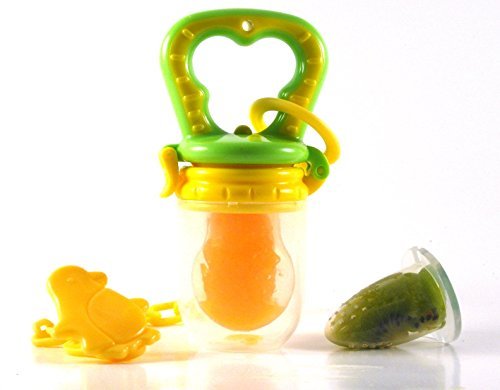 Baby Food/Fruit Feeder with a large size silicone sac, feeder clip, bonus small size silicone sac;Makes feeding easy, without risk of choking;Chilled/Frozen food in silicone sac help soothe sore, puffy gums;Ideal for 4+ months; dishwasher safe;FDA certified and BPA free