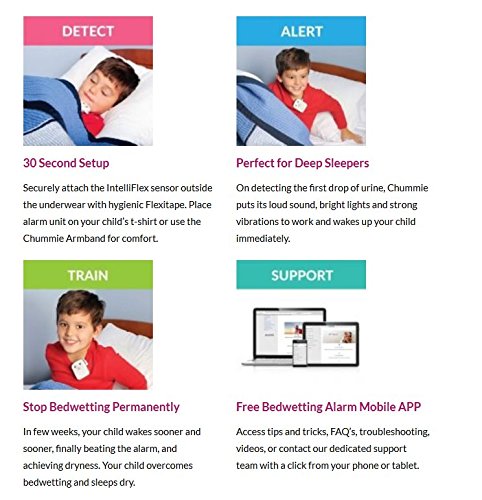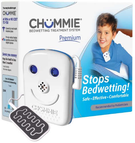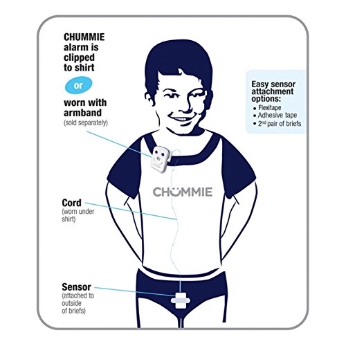 More pediatric urologists recommend Chummie over other bedwetting alarms. Chummie provides savings of over $1,000/year on diapers, laundry and prescription medication. The award winning alarm provides patented synchronized light-sound-vibration technology for maximum efficacy and treatment effectiveness to stop bedwetting in deep sleepers and children in weeks. The child-friendly, tamper-proof alarm unit is 40% smaller than a credit card, weighs 1 oz. and can easily be programed by a 4-year old. A selectable switch can be easily set to choose from three customized alert settings: sound and vibration, sound only, or vibration and adjust alarm volume level. To avoid auditory accommodation when the alarm goes off, select from eight tones and control volume level. Use a different tone each night for a total of 32 alert combinations. Chummie is the World's most advanced bedwetting treatment system. The microprocessor controlled alarm unit detects first sign of wetness and alerts your child. Patented ?Enhanced Protection Plus? technology cuts electric current through the sensor to eliminate risk of skin rash caused by other bedwetting alarms. Patented ?Active Guard Monitoring? checks and alerts parents of user error which delay treatment. The alarm unit provides two step turn-off to increases treatment success. Patented non-corrosive Intelliflex silicone sensor is thin and gently conform to body contours for maximum comfort. Sensor?s one drop detection technology results in instant urine detection for less mess and rapid treatment. No clips that poke sensitive areas and cause discomfort that can interfere with sleep. No toothbrushes to clean, simply rinse under tap water and pat dry for immediate reuse. Use it tonight kit contains: alarm unit, intelliflex sensor, snap-on clip, flexitapes, progress diary, achievement certificate, user manual, 2 AAA batteries, registration car