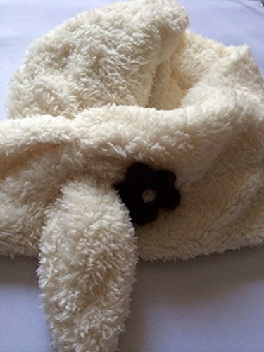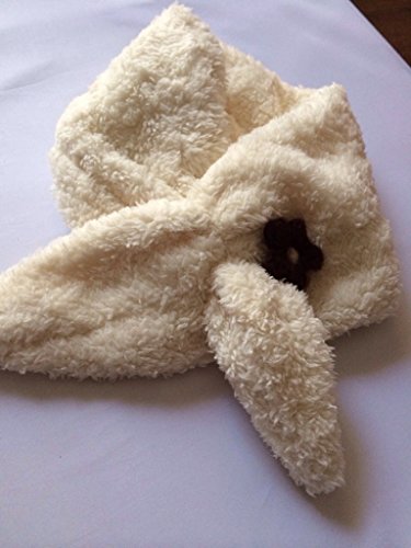 かわいいお花付きの軽いふわふわマフラーです。 前でしっかり留めて固定出来るので使いやすいです。巻き付かず安全です!