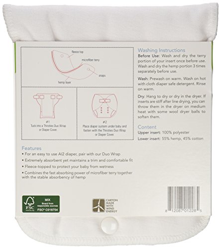 The first insert of this two-insert system is constructed of two layers of our fast absorbing microfiber terry and topped with our stay-dry and stain-resistant microfleece;The second insert, which should be snapped to the underside of the microfiber insert, consists of 5 layers of our super-absorbent 55% hemp - 45% organic cotton jersey;For an easy to use all-in-two diaper, pair with our Duo Wrap diaper cover;Extremely absorbent yet maintains a trim and comfortable fit;Combines fast absorbing power of microfiber terry together with the stable absorbency of hemp and organic cotton