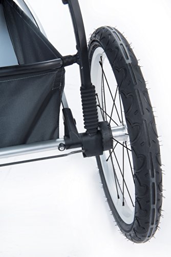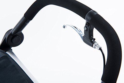 Fixed front wheel provides increased stability when moving at a fast pace;Extended multi-position handlebar provides a generous kick stride;Hand-activated front brake increases braking control on steep terrain;One-handed compact fold for storing and transporting;Padded seat with vented top reclines to a near flat position for on-the-go naps