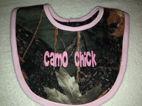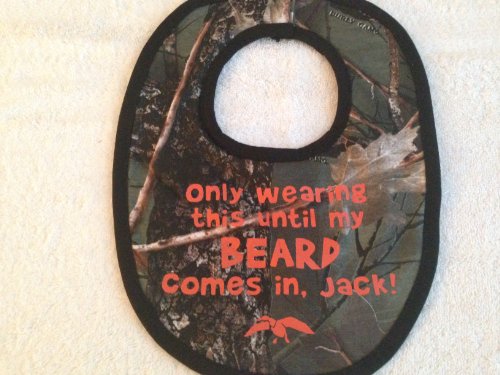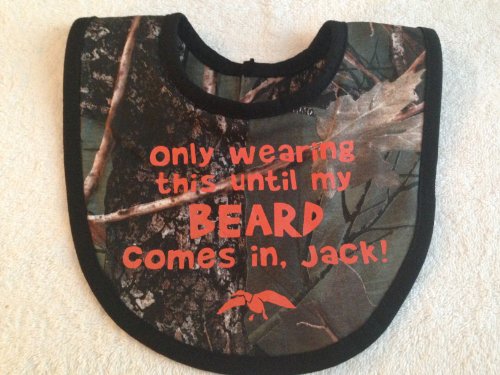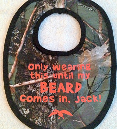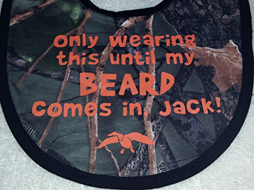 Camo baby bib;Inspired by the hit TV Series, Duck Dynasty, as seen on A&E tv.;Bib is both novel and useful. Your Duck Dynasty friends will love it! (others... just confused!);Available without wording... or customize with your own words.;Only wearing this until my beard comes in, Jack! TM