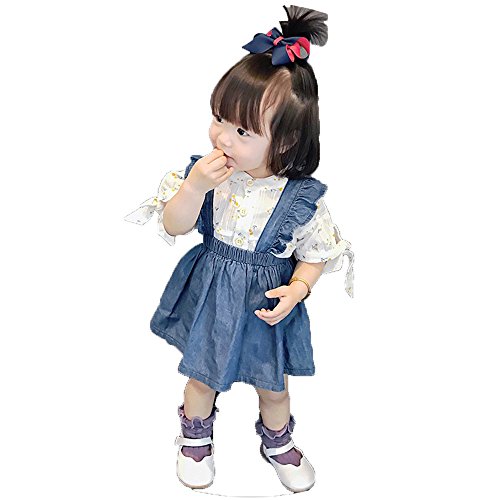 サロペットスカート プリーツスカート 半袖シャツ 夏 フリルサスペンダー付きスカート 上下セット 桜桃柄 1~3歳 デニムブルー73cm