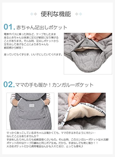 生地の経糸と緯糸のすき間の大きさを髪の毛より細い10μm以下にすることで、アレルギーの原因となるダニやハウスダストを遮断してくれるアンチアレルギー素材を使用。水分や空気はちゃんと通すので快適な空間を提供します。ベビーケープをしたまま座った時、赤ちゃんの足元が窮屈にならないように足出しポケットがついています。これでバスや電車などに乗った時も赤ちゃんがぐずらずにいてくれるはず! またパパ・ママの手を温めてくれる便利なカンガルーポケットもついています。ポケットの裏地もボアを使用しているので、手袋をしていなくても手を温めてくれます。携帯電話なども入れておける大きさが嬉しいですね! 高級感溢れるキルティング加工に、おしゃれママにぴったりの北欧風プリントを取り入れることでおしゃれ&高級感にもこだわりました。 他とは違うおしゃれなベビーケープはいかがですか?