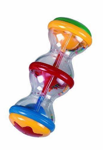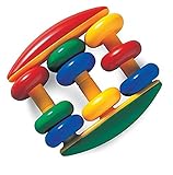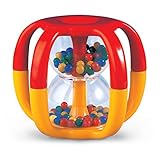 シェークラトル&ロールは振ると小さなビーズがサラサラと音がします。 逆さにして砂時計のようにビーズの流れを目で追ったり、ラトルを転がしたりして遊びます。 上部にはキュッキュッとなる星型のボタン付き。