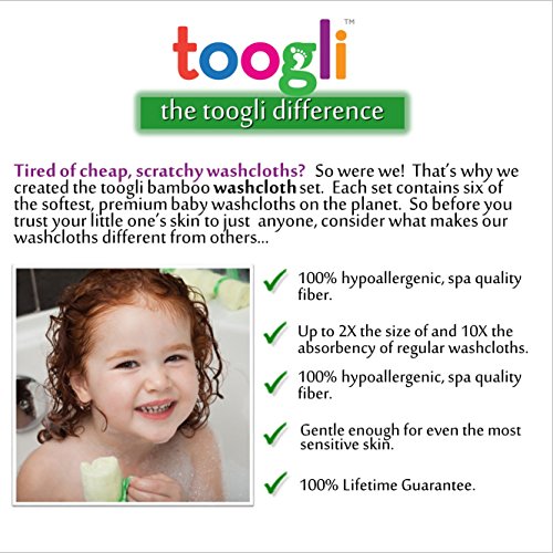 WHY USE SCRATCHY WASHCLOTHS when you can take your baby's bath time to the next level with our premium, extra soft, re-usable and absorbant Bamboo Washcloth Set;NATURAL IN COLOR, these adorable unisex cloths are the perfect newborn bath gift for boys or girls;CRAFTED WITH LOVE from our 100% hypoallergenic, spa quality fiber and ideal for sensitive baby skin care issues including eczema, cradle cap and baby acne;EXTRA-LARGE 10X10 INCH SIZE - these wash cloths soak up bath water like a natural sponge and are large enough for toddlers, older children and even adults;100% Satisfaction guarantee - Add to cart with confidence knowing that our washcloths are backed by the Toogli 100% zero-hassle lifetime guarantee - see details of our amazing guarantee in our product description!