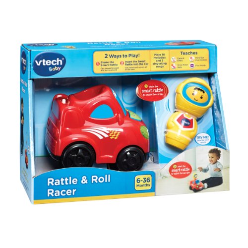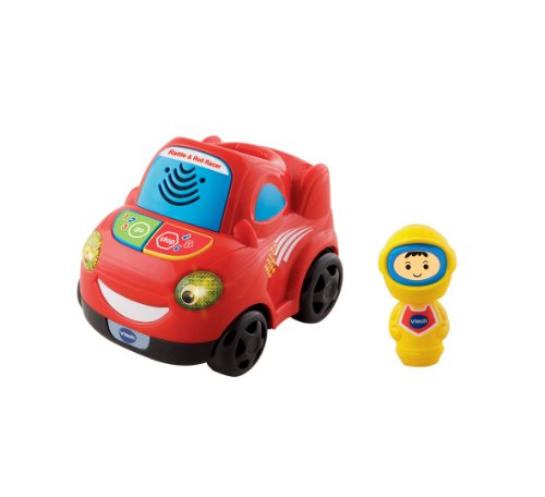 Car racing is exciting with the Rattle & Roll Racer! Features a cute interactive rattle race driver who, when you shake him, can make the car race forwards and backwards. The car speaks with a British accent, introducing baby to lots of fun phrases. Includes stop and go buttons on the bonnet that introduce role-play and real-life car features, with super fun accelerating and braking sound effects. Two LED headlights flash to attract baby's attention. Includes ten uplifting melodies and six happy sing-along songs for baby to enjoy.