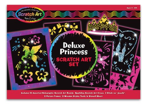 This enchanting set is fit for a princess! Reveal glittering colours as you draw and trace pretty designs onto a tiara and 12 Scratch Art boards. The tiara features a glistening gold background and stick-on gemstones! Includes: ?3 gold holographic Scratch Art boards ?3 silver holographic Scratch Art boards ?3 pink holographic Scratch Art boards ?3 multicolour holographic Scratch Art boards ?Gold holographic tiara ?3 stick-on gemstones ?Stencil sheet ?2 wooden stylus sticks