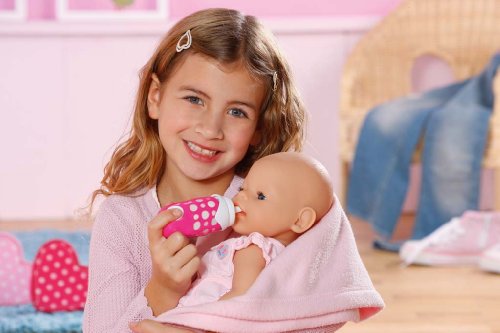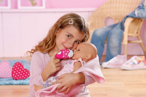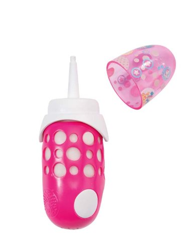 Great interactive accessory for baby feeding time. Insert the bottle into your baby doll's mouth and you will hear drinking sound whilst pressing the button. When baby is finished drinking from the bottle, pull the bottle out, release the button and you will hear burping sound. Also works manually with other dolls. Includes cap. Requires 3 x AG13 batteries, included.