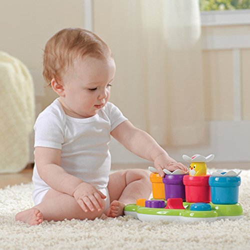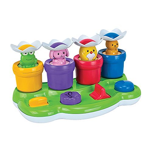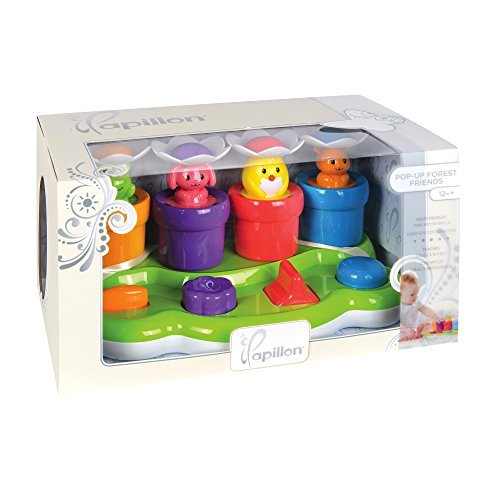 Enjoy hours of fun and learning with the Papillon Pop Up Forest Friends Musical Activity Toy. Children will delight in mastering the ability to press, flip, slide and turn with this set. Teach babies object permanence, cause and effect, and motor skills. With a carry handle, this set is easily transported anywhere. Manipulate each colored control to make a forest friend pop out of its flower pot. This set is recommended for ages 6 months to 4 years.